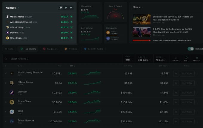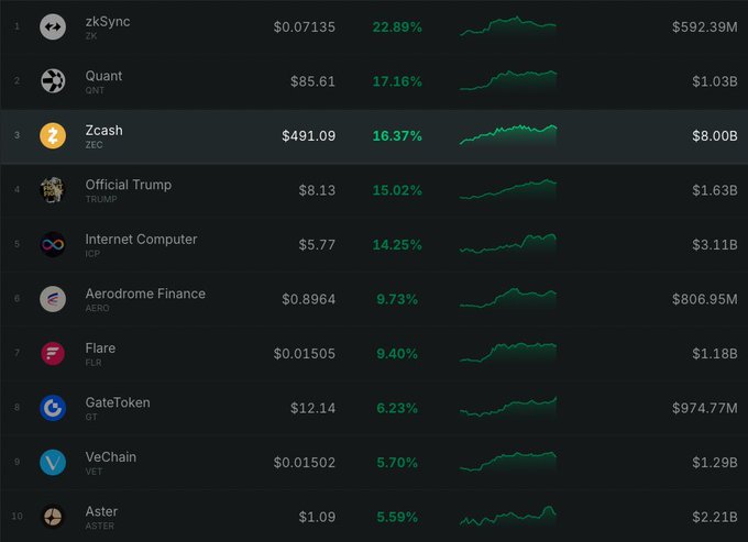 BREAKING: $ZEC is back among the top gainers, surging past an $8B market cap as it closes in on $500! 🚀