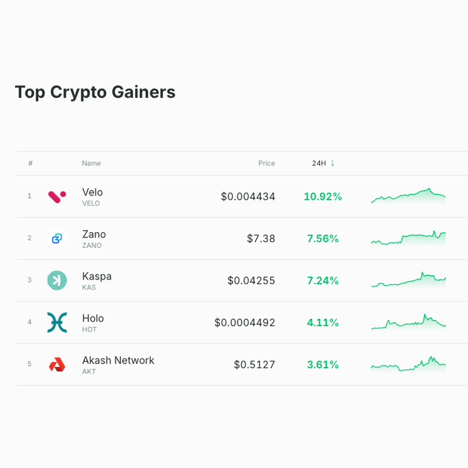 While the broader crypto market is falling, these 5 coins are still in the green 🔷 $VELO (+10.9%) 🔷 $ZANO (+7.6%) 🔷 $KAS (+7.2% ) 🔷 $HOT (+4.1%) 🔷 $AKT (3.6%) Outperforming the dip and showing strength 👀