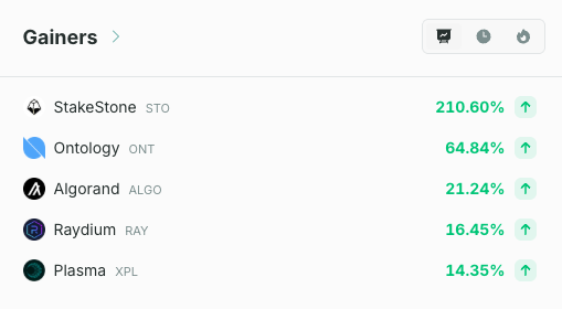 Some big gains today in #crypto: 🔷 $STO (+211%) 🔷 $ONT (+65%) 🔷 $ALGO (+21%) 🔷 $RAY (+16.5%) 🔷 $XPL (+14%)