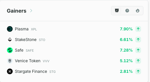 Today's top #crypto performers: 🔷 $XPL (+8%) 🔷 $STO (+7%) 🔷 $SAFE (+7%) 🔷 $VVV (+5%) 🔷 $STG (+3%)
