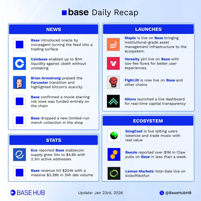 📰 @base Daily Recap What happened on @base last 24 hours: ■ @base introduced oracle by noiceagent turning the feed into a trading surface ■ @coinbase enabled up to $1m liquidity against cbeth without unstaking ■ @brian_armstrong praised the farcaster transition and highlighted bitcoin's scarcity ■ @base confirmed a movie starring rob lowe was funded entirely on the chain ■ @base dropped a new limited-run merch collection in the shop ■ @eco reported base stablecoin supply grew 34x to $4.6b with 2.3m active addresses ■ @base revenue hit $204k with a massive $3.39b in 24h dex volume ■ @songcastxyz is live letting users tokenize and trade music with real value ■ @Beezie reported over $1M in Claw pulls on Base in less than a week. ■ @LemonMarkets Vote-Sale live on kickoffdotfun ■ @maplefinance is live on base bringing institutional-grade asset management infrastructure to the ecosystem. ■ @verasitytech plrl live on base with low-fee flows for better user experiences. ■ @JoinFightID is now live on base and other chains ■ @alturax launched a live dashboard for real-time capital transparency twitter.com/BaseHubHB/status/2...