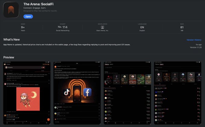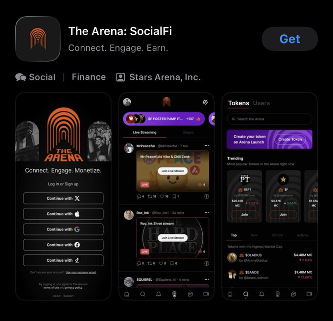 This @TheArena iOS app drop is solid Been using Arena for 2+ years since @jasonmdesimone took over > Best SocialFi app I've tried > Mobile version feels exactly like web > Spaces are active (194 people listening) > Clean P&L sharing features Left them a 5-star review to help with discoverability