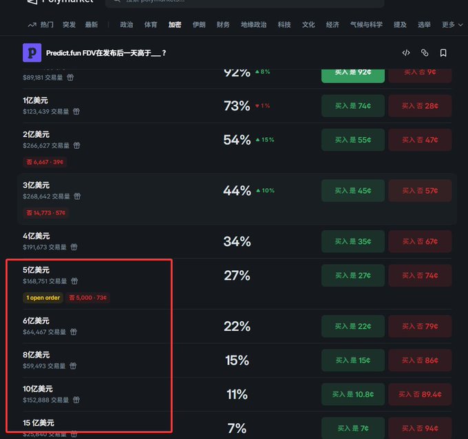 Predict's predictions on Polymarket show a high proportion of FDV funds exceeding 600 million and 800 million, with 15% at 800 million, 22% at 600 million, and even 11% at 1 billion. This contradicts some of the narratives circulating on social media. Unless there's some inside information. I bought some FDV NOs these past two days. I suggest prioritizing buying from 800 million, 600 million, and 500 million. 200 million and 300 million are short-term premiums with large fluctuations in the funding curve; they will eventually revert to an average, but don't hold them long-term, considering OPN is only 300 million. Anything I don't understand might be due to something I don't know. I'm betting on one hand, and on the other hand, @predictdotfun is using it as a safeguard. The only Binance-affiliated bet is ⬆️. I'm betting the first prediction will be bad as a test, the second will be genuine support, and there's also the market trend in the second half of the year; perhaps the TGE environment will be different from now. For safeguards, you can refer to my previous tutorials.