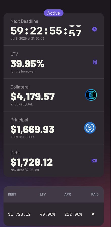 I just lent someone 1680 USDC on @DebitaFinance for a vote escrowed $EQUAL as collateral for a whooping 212% APR It has 40% LTV, which means if he doesn‘t pay back, I shot this beauty for 0.8$ per #EQUAL If he pays back I earned 212% APR Win Win for me $S #SONIC