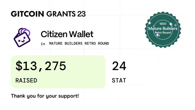We are proud to be included in Gitcoin's GG23 Mature Builders round - their way of recognising proven, high-impact teams helping sustain Ethereum. Citizen Wallet raised $13,275, and we're excited to keep building tools that help communities onboard users to web3.