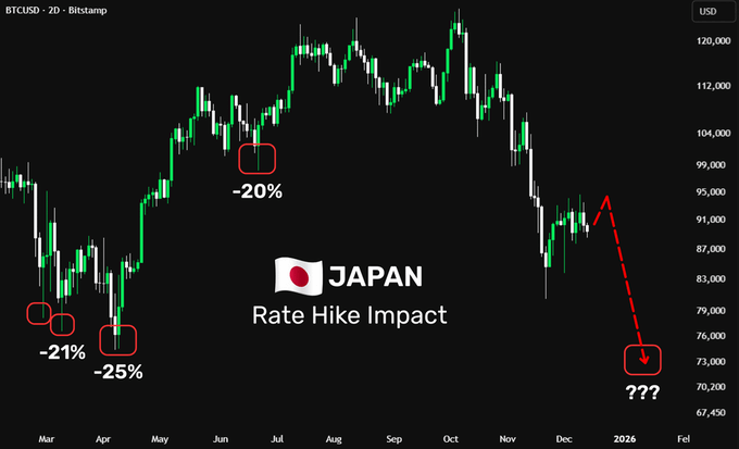 🚨 HISTORY IS REPEATING Every time Japan hikes rates $BTC dumps 20%. At least one more hike is coming soon. If it repeats, $BTC will dump to $50K. Don NOT say I didn't warn you. twitter.com/DeFiTracer/status/...