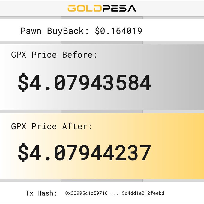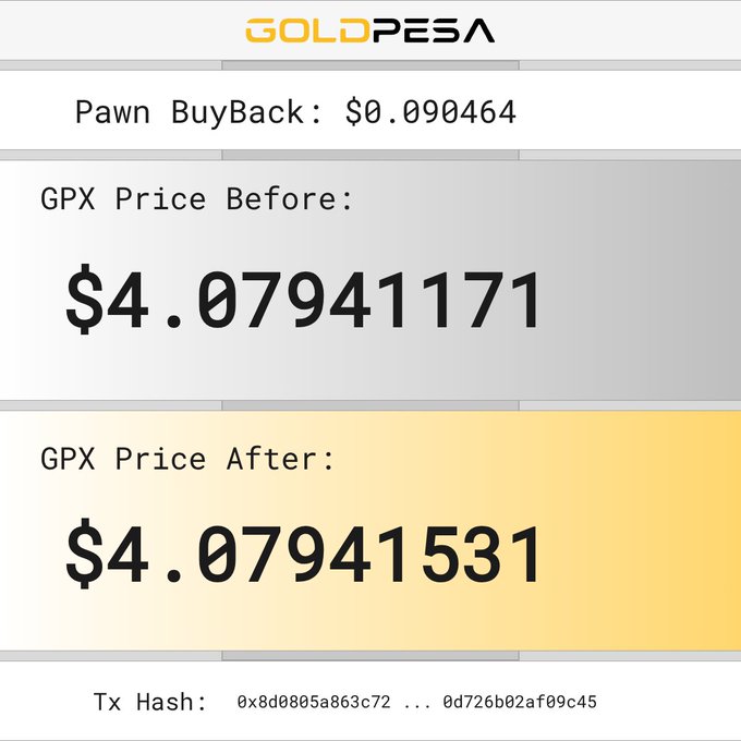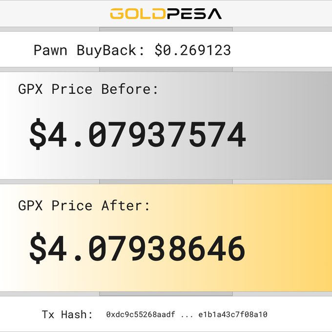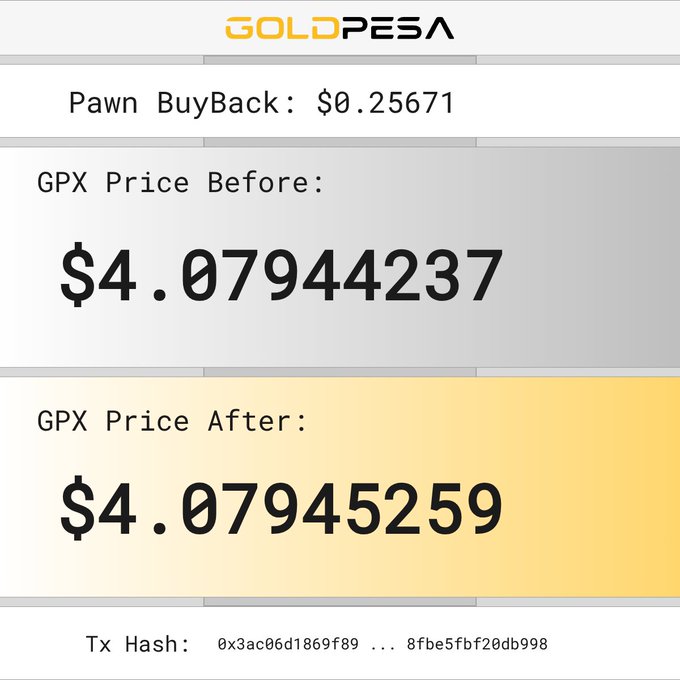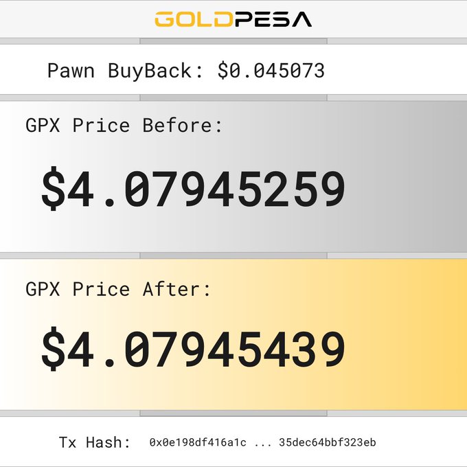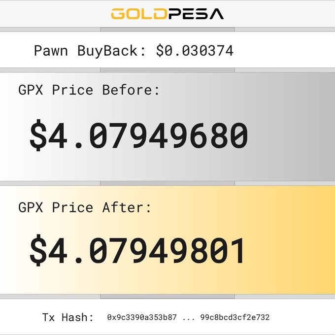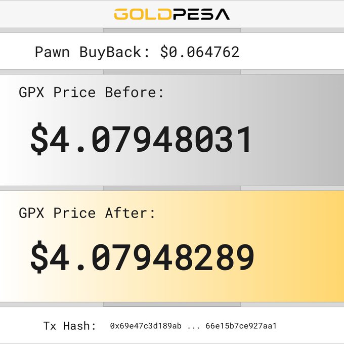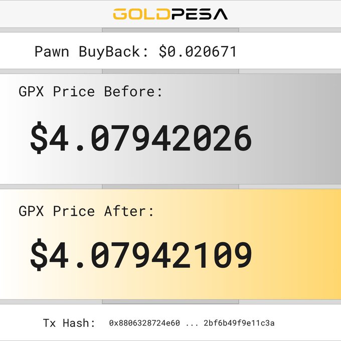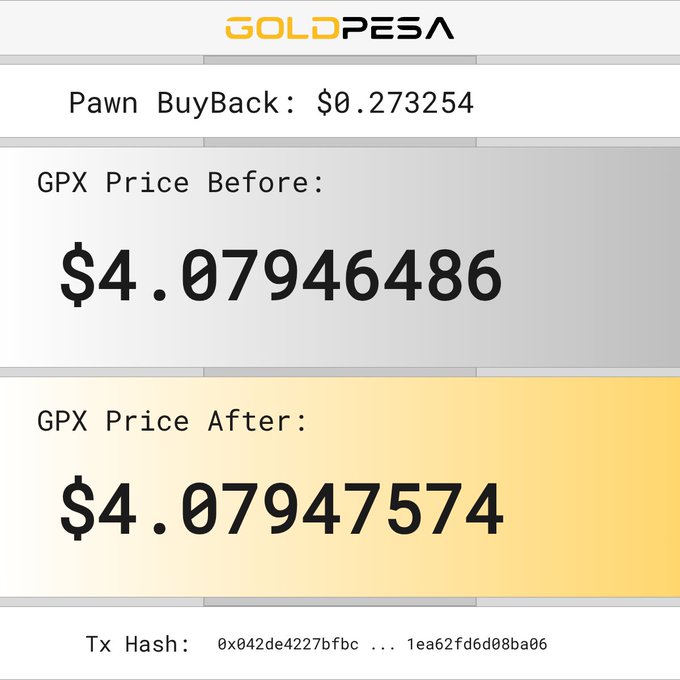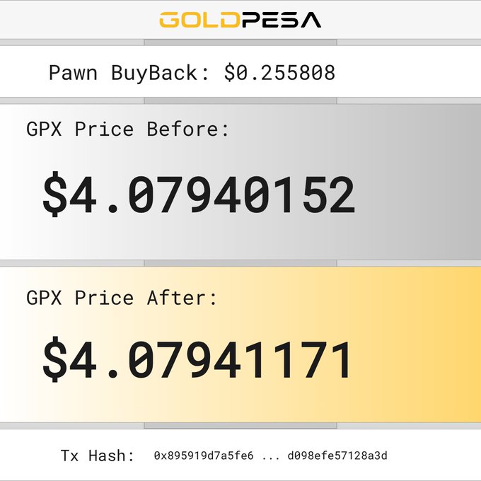 📌 New Pawn Buy Alert! 🧙 The Pawn bought 0.06208034 GPX 💵 For $0.255808 USDC 📊 GPX Price Before: $4.07940152 📈 GPX Price After: $4.07941171 🔗 Tx Hash: 0x895919d7a5fe6c380b43c27ed1d20191a2b0917d4641759b7d098efe57128a3d #goldpesa #whitebeard #pawn