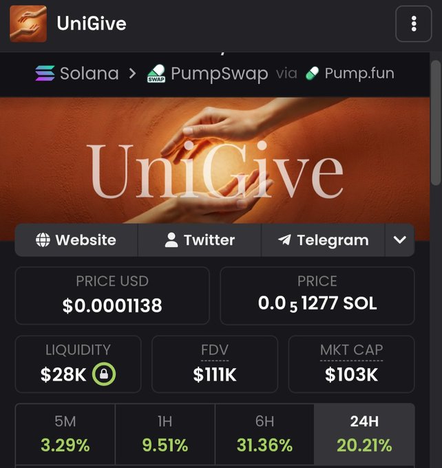 What does $GIVE do? A portion of creator fees goes to a treasury for charitable donations. Also supports token buybacks and burns (recently: 15 SOL done)Donations: sent 19 SOL to UNICEF Goal: Turn trading into "real, tangible impact" with transparent giving.