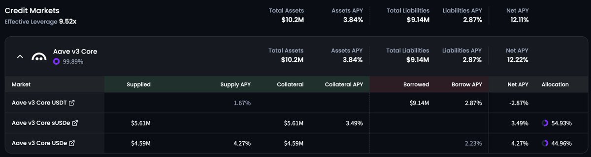 The play here is the spread: borrowing USDT on Aave only costs 2.87% right now. By looping this almost ten times, Tau Labs is generating a 13.71% yield.