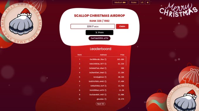 I have just claimed 229.17 sSCA for their Christmas Airdrop Event! @Scallop_io is the leading money market for Sui. They are now rewarding users who have interacted with the Scallop ecosystem. Check your eligibility here👇 xmas.scallop.io