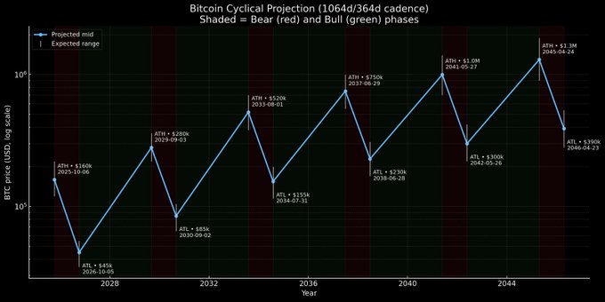 If Bitcoin’s 1064-day bull / 364-day bear rhythm holds, we’re right on schedule.