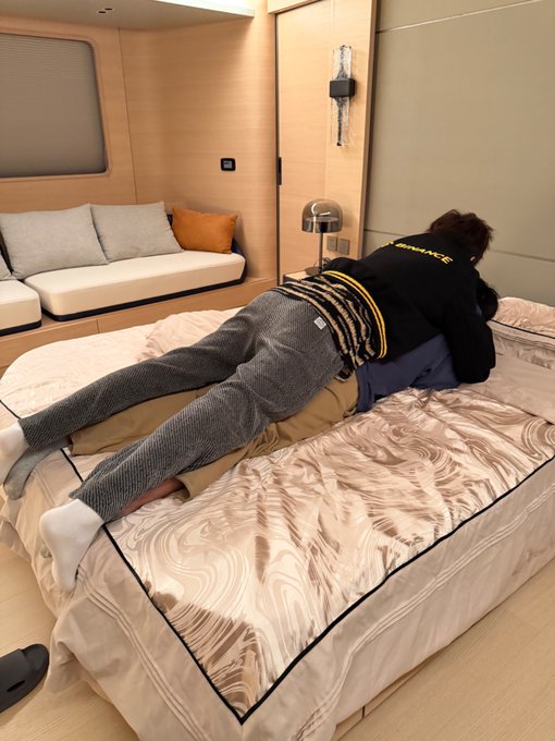 Hmm, the arrangements were so thoughtful! Not only were there girls, but there was even a bed on the yacht! I was the only one wearing Binance clothes. This Binance outfit I just received has a really nice cut. @sisibinance