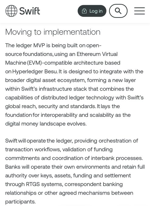 Swift - “The ledger MVP is being built on open-source foundations, using an Ethereum Virtual Machine (EVM)-compatible architecture based on Hyperledger Besu. It is designed to integrate with the broader digital asset ecosystem..” twitter.com/ChadSteingraber/st...