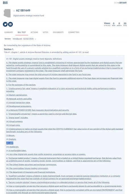 Arizona's Digital Assets Strategic Reserve Fund bill (SB1649) cleared the Senate Finance Committee in a 4-2 vote. The bill now advances to the Rules Committee. It explicitly states that XRP will be in the Reserve Fund. Every State will have one.✅ twitter.com/ChadSteingraber/st...