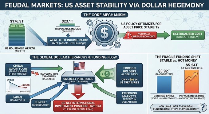 Really solid piece on feudal markets, which tells us how US policy protects asset prices over everything else. But there's a missing piece on how does the US even pull this off without the economy collapsing? Answer is dollar hegemony. It's not just helping the system it IS the system. Here's how🧵 Right now, US household wealth is $176.3T while disposable income is $23.1T. That's a ratio of 763% meaning assets are worth nearly 8x what people actually earn. In any normal economy, that breaks. It doesn't here because the US exports the cost. ➢ The US runs deficits, foreigners fund it ➢ Foreign holders own ~$9T in US Treasuries ➢ The US Net international investment position is -$26.14T That -$26T is basically a giant loan from the rest of the world to keep US asset prices up. China ran a $1.08 trillion trade surplus in the first 11 months of 2025 but their Treasury holdings dropped to around ~$750 by mid 2025 (down from $989B in 2021 which is lowest levels in years). They're making money selling to the world but stopped recycling it into US debt at the same rate. They're backing away. US focuses on asset prices, Japan on bonds, China on exports, Europe on coordination but these aren't just different strategies, it's a hierarchy. The US gets to focus on asset prices because the dollar forces everyone else into supporting roles... 1. China has to run surpluses to balance US deficits 2. Foreign holders have to buy Treasuries 3. Emerging markets get stuck in dollar debt Remember who's buying US Treasuries has changed👇 ‣ Central banks: $3.92T (flat since 2013) ‣ Private investors: $5.24T (up 240% since 2013) Note that central banks buy for stability (they hold no matter what) while private investors buy for profit (they leave when returns don't make sense) The system used to run on stable money. Now it runs on hot money. The money propping this up is getting less reliable. The question I keep asking myself is how long before the global funding base stops playing along? h/t to Nano Banana for infographics twitter.com/YashasEdu/status/2...