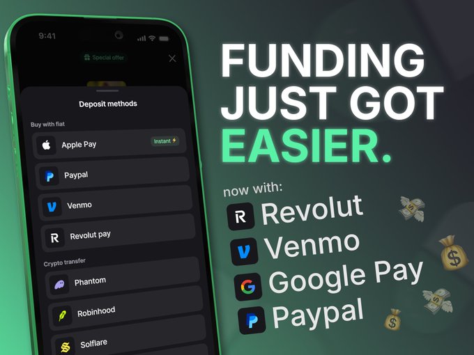 funding just got easier 🔥 onramp now with Revolut, Venmo, Google Pay & PayPal, powered by @moonpay switch to the best mobile trading app today 👇