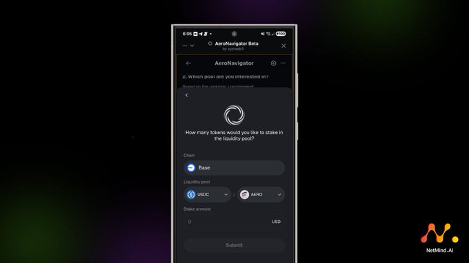 "Generate the optimal token purchase advice for me based on market data and risk analysis for @base " "Show me the ranking of stablecoin pools on @AerodromeFi " "Help me predict the yield of staking tokens in a liquidity pool for one week" These are just some of the many capabilities of AeroNavigator. The future of DeFAI is here. Sign up for the waitlist: aeronavigator.xyz