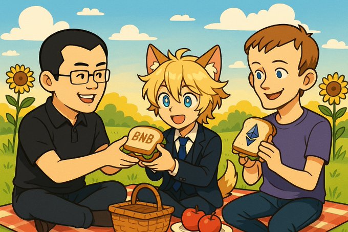 A picnic with the pioneers of the space. Talking about #BNB, #ETH and enjoying the sun. Thanks for sharing your sandwich CZ! Good vibes only!☀️
