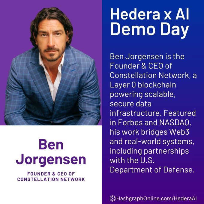 Hedera x AI Demo Day 🌌 Meet the Judge: @BenJorgensen Founder & CEO of @Conste11ation, Ben is an entrepreneur and investor focused on building decentralized infrastructure for real-world use. Constellation provides Layer 0 blockchain solutions for secure, scalable data - and is