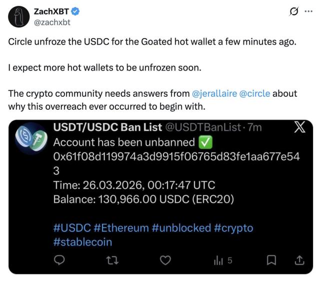 Circle removes 1/16 USDC wallets from blacklist after backlash.