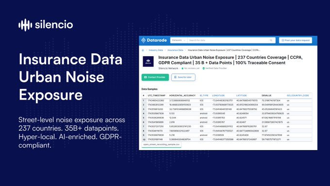 Noise-level Data for insurance companies is now available. Street-level noise exposure across 237 countries. 35B+ datapoints. Hyper-local. AI-enriched. GDPR-compliant. Chronic noise is linked to stress, sleep disruption, heart disease. Now it’s measurable. Now it’s actionable.