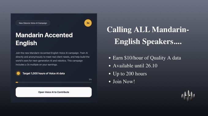 6-Days Remaining Mandarin speakers (speaking English), last chance to earn $10/hr in $SLC for training AI. Only the first 200 hours of Class A recordings will be rewarded. Deadline: 26.10 Don’t miss it. Start recording now: ai.silencio.store twitter.com/silencioNetwork/st...