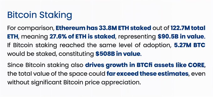 If Bitcoin staking reaches the same adoption level as Ethereum, 5.27 million BTC would be staked—over $500B in value. And that’s without factoring in any Bitcoin price appreciation. We are so early. 🔶
