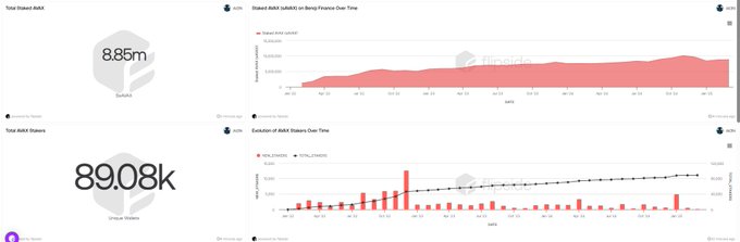 1/ Since January, liquid staked $AVAX on @BenqiFinance has surged +5% to 8.85M $AVAX, with over 5,700 new stakers jumping in!