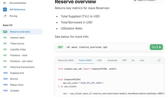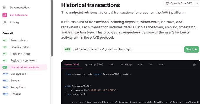 Just shipped: a single API call to fetch the full history of any user/wallet — deposits, borrows, repayments on @aave. You no longer need to scrape block explorers or stitch logs together. Available now via Compass API.