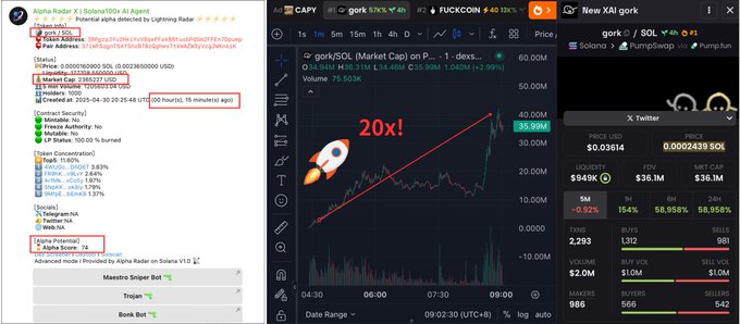 $gork - 20x opportunity detected by Alpha Radar Solana100x AI agent 38PgzpJYu2HkiYvV8qePFakB8tuobPdGm2FFEn7Dpump Alpha Radar Solana100x AI Agent locked onto $gork just 15 minutes after its launch at 2.3m mcap —before it sent shockwaves through the market with a 20x pump! In