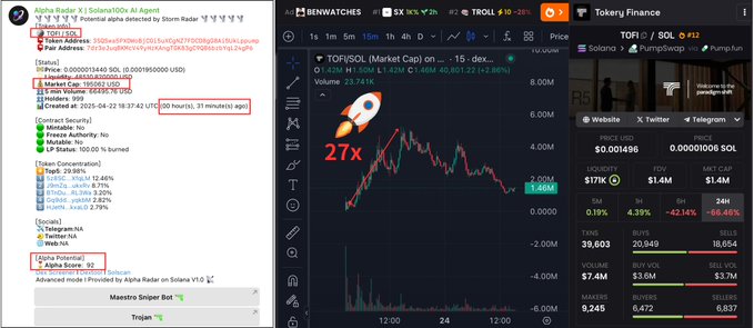 $TOFI - 27x opportunity detected by Alpha Radar Solana100x AI Agent 3SQSwa5PXDWoBjCGi5uXCgNZ7FDCD8gG8Ai5UkLppump Our proprietary Solana new token AI model identified the potential of $TOFI at 30mins after its launch, and then it pumped by 27x after the notification to our Alpha