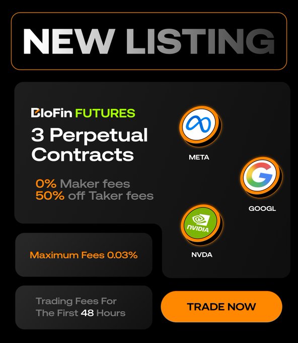 #BloFinFutures will list the $META-USDT, $GOOGL-USDT, and $NVDA-USDT Perpetual Contracts 🧑💻 Trade and take advantage of: ✅ 0% Maker Fees ✅ 50% off Taker Fees Details: support.blofin.com/hc/en-us/ar...…