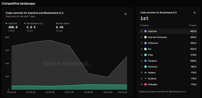 Over the past week, Injective recorded 460 code commits, securing the #1 position among L1 blockchains.
