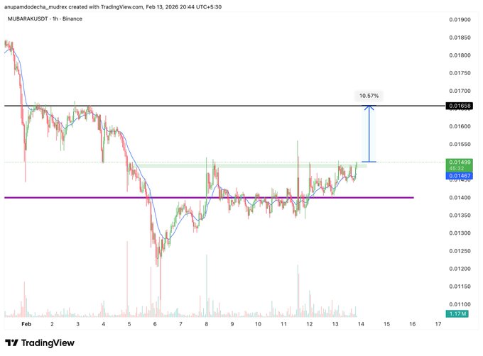 Bonus TA Setup for the Weekend!🔥 #2 Chart of the Day: $MUBARAK Why this token today? $MUBARAK is attempting to break the key $0.015 level while overall market sentiment remains supportive after positive CPI data. Price structure looks bullish heading into a decisive zone. Any news or event? Binance’s “Ramadan is coming” teaser, seasonal narrative strength, and past CZ mentions that triggered rallies are adding positive sentiment. The cultural relevance factor is clearly influencing momentum. Technical snapshot • Trend: Bullish • Support: $0.01444 • Key level: $0.01500 • Resistance: $0.01658 What to watch for • Above $0.01500 → Strong 4H close can push price towards $0.01658 • Below $0.01500 → Bearish continuation risk, move back towards $0.01444 Current view Bullish (watch the 4H close at key level) For learning purposes. Not investment advice. #ChartOfTheDay #Altcoins #CryptoMarkets #trendingcrypto #technicalanalysis #CryptoTrading