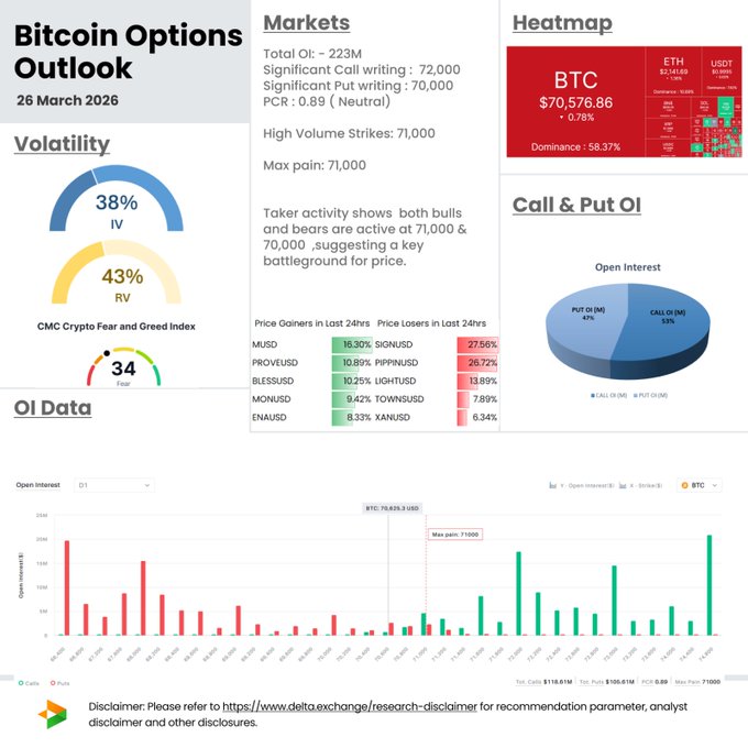 Bitcoin Options Outlook • IV at 38% vs RV at 43% → relatively stable vol environment • PCR at 0.89 → neutral positioning • Max Pain: 71K → key magnet level • Heavy activity at 70K–71K → major battleground #BTC #CryptoOptions