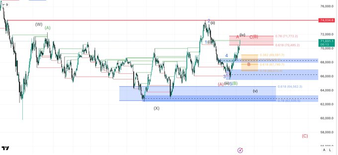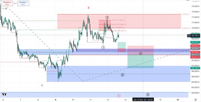 BTC still trading below the key 0.78 Fib resistance (71,722). As long as price stays below this level, downside risk toward 64K remains. 📉 Key Support Zone: 66,813 – 69,091 (0.3–0.6 Fib) This area could act as a demand zone where the market may attempt a bounce to form the C wave of the larger B-wave structure. 📊 Levels to Watch: • Support Buy Zone: 66,813 – 69,091 • Breakout Level: 71,722 • Downside Risk: 64K If price reacts strongly from support → potential C wave move up. A clean break above 71,722 increases probability of a larger wave C expansion.