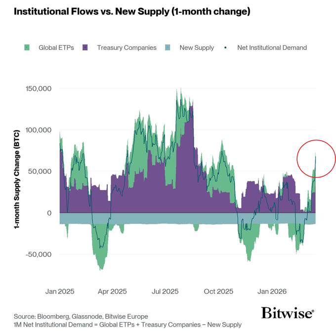 Institutional demand for $BTC has hit its highest level since October 2025, with institutions absorbing 81,200 BTC last month, 6x the new supply, per Bitwise.