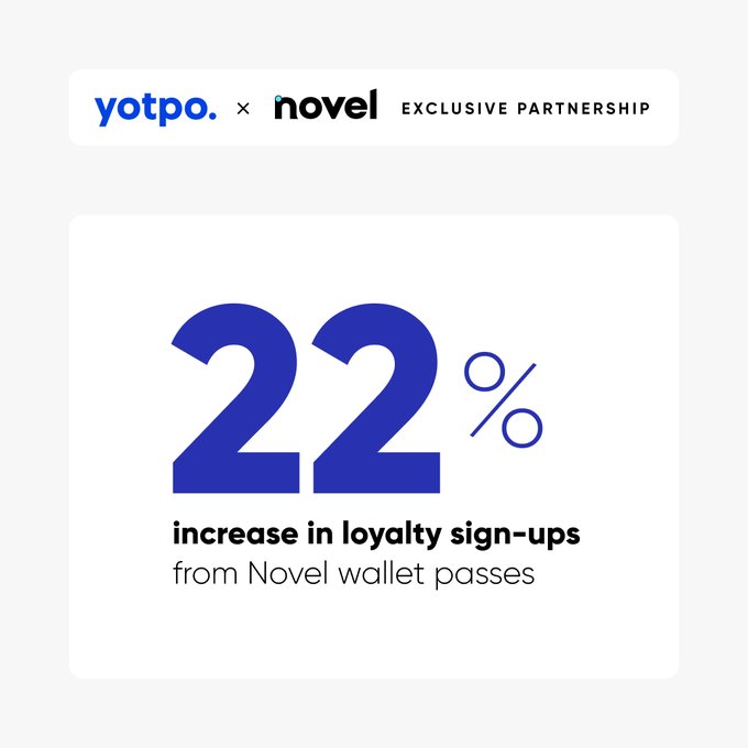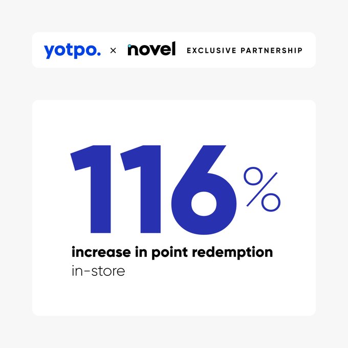 Your In-store loyalty just went viral. With Novel Wallet Pass + @Yotpo Loyalty, customers can redeem rewards in seconds — no app, no prob. Brands using the integration have seen a 116% increase in point redemption in-store, proving that when redemptions are simple, engagement can