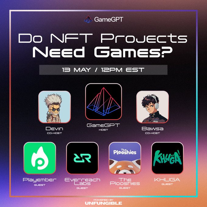 This week it’s all about NFTs and gaming. So, does every NFT collection need a game? This week’s panel: @Devin_Web3 @jbawsa @play_ember @EverreachLabs @ThePlooshies @Khugaverse