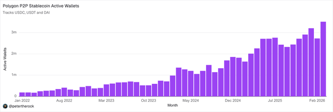 P2P stablecoin senders on @0xPolygon at all time high, up 28%! This is the number i obsess over, people just sending money to each other on the payments chain. twitter.com/sandeepnailwal/sta...