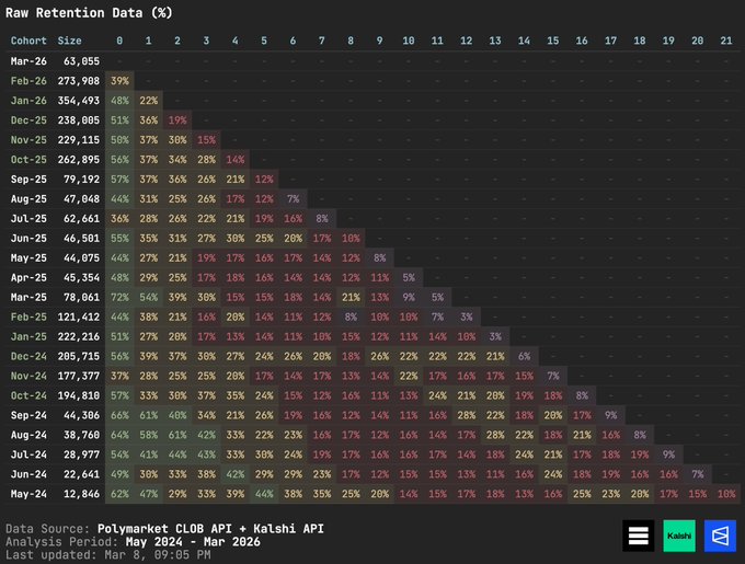 Prediction markets are onboarding *273,908+ new users every month The retention is what's interesting 50.2% stay more than 1 month 30% stay more than 3 months