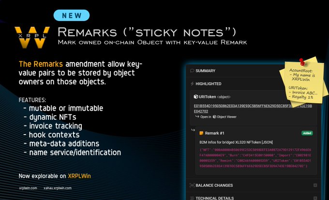 Remarks on Xahau are active, and they are awesome. XRPLWin now fully supports display for this novel amendment, including transaction details, list and object viewer. 👇See it in action xahau.xrplwin.com/tx/C0D994040...…