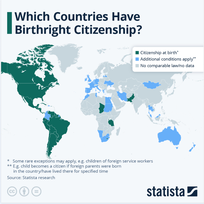 Birthright citizenship is not unique to America, Truth Social posts to the contrary. See this chart from May 2025: