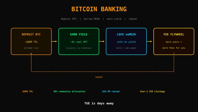 been digging into @mezonetwork before TGE and looks interesting. ~4% yield on BTC directly from protocol revenue. $80M already in the vaults and the token isn't even out yet. the part most interesting part is the fee flywheel: institutions deposit BTC → mint MUSD → generate protocol fees → veMEZO holders vote on where those fees go. more institutions in = more fees = more value for lockers. and institutions who don't want to hold $ MEZO can rent your veMEZO position, secondary yield on top of the base. $28.5M from Pantera, Multicoin, GSR. if you lock MEZO into veMEZO early you basically get first dibs on where yield gets directed. that voting power dilutes fast once everyone else come.