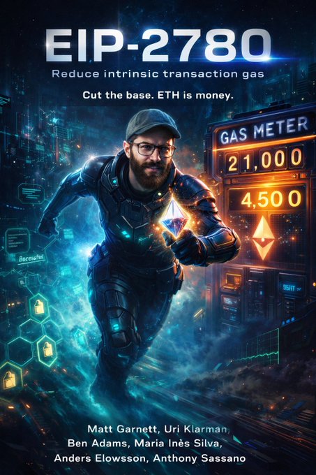 Should we have promotional posters for all Glamsterdam proposed EIPs? 🤔 EIP-2780: Reduce intrinsic transaction gas Cut the base. ETH is money.