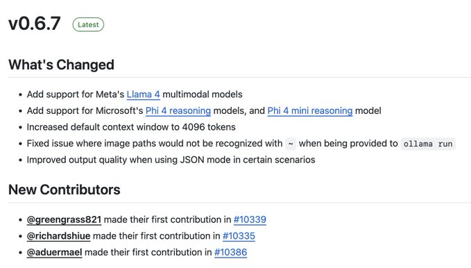 Ollama v0.6.7 is out with support for Meta's llama 4 (Scout and Maverick) and Microsoft's new Phi 4 reasoning models. Default context is now set to 4096 tokens.