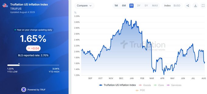 The latest Truflation data shows U.S. inflation running at just 1.67%, far below the Fed’s 2% target and a steep decline from earlier in the year.