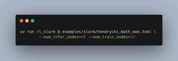 we just merged slurm support into prime-rl, a single command that render and start a slurm script to start a large moe training over 512+ gpus we also have k8s support