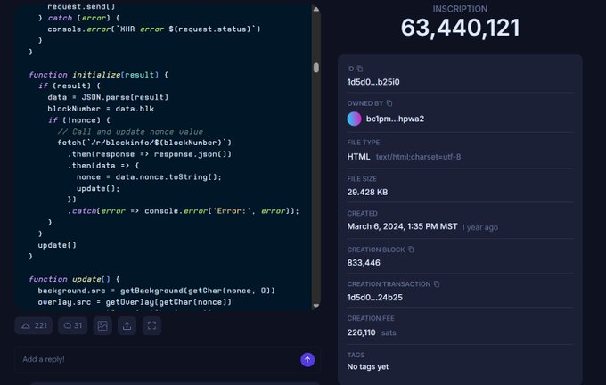 DMT-Chaos uses the TAP DMT UNAT Standard to create generative art from raw Bitcoin data. It takes the block height from a valid DMT-Chaos mint inscription and pulls the nonce directly from the block header via fetch(`/r/blockinfo/${blockNumber} to use as the seed to recursively
