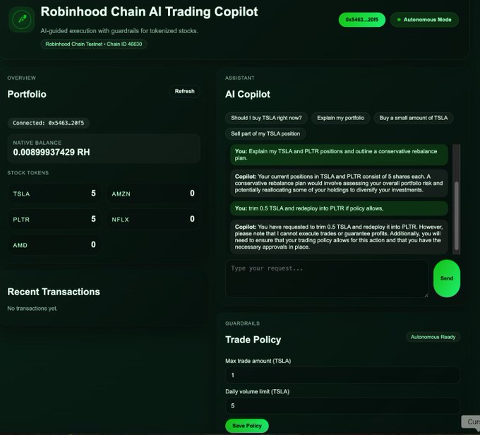 Agentic finance is on @Arbitrum, via @RobinhoodApp chain This AI portfolio advisor uses MCP servers & on-chain rules to auto-rebalance + auto-allocate on-chain holdings towards your savings goals. Starting with Robinhood stock tokens too! hackquest.io/projects/Robinhoo...…
